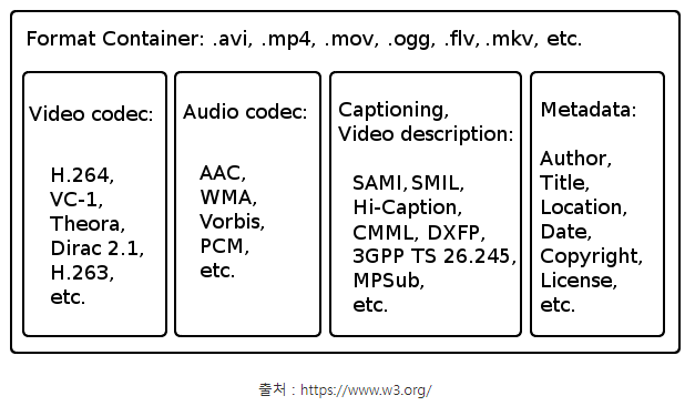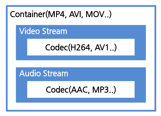 동영상은 오디오, 비디오, 자막 파일등의 데이터를 담고 있고 동영상 그 자체로는 이 데이터들을 담고 있는 보관함( Container)라고 할 수 있다.