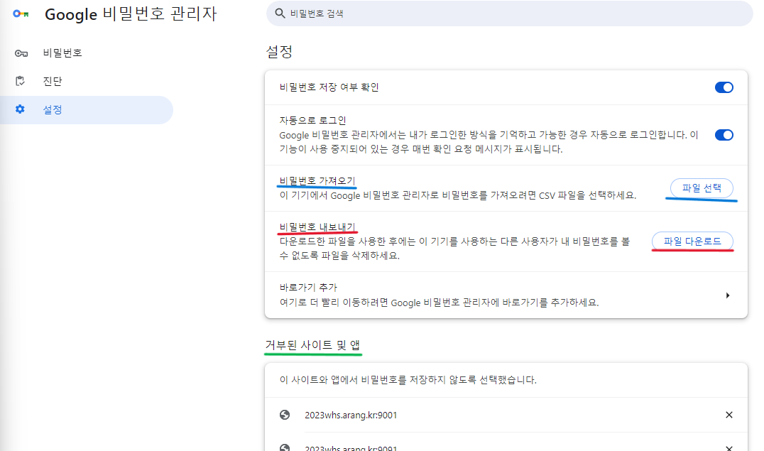 설정 탭에서 .CSV파일로 비밀번호 내보내기와 가져오기가 가능하다.