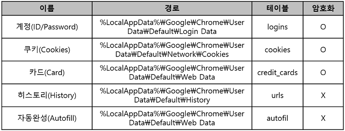 | Chrome | C:\Users\<사용자 이름>\AppData\Local\Google\Chrome\User Data\Default\Login Data |