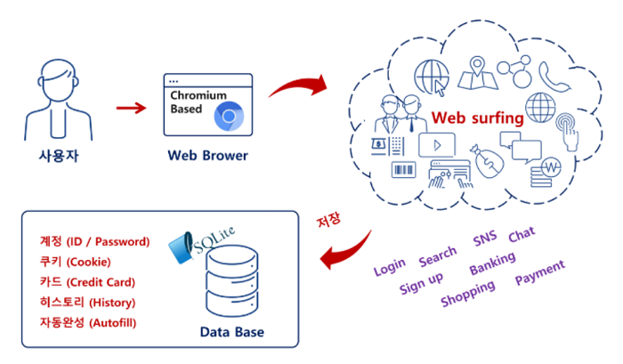 Chromium 기반 웹 브라우저는 사용자가 웹 서핑을 하면서 저장하는 계정(아이디, 패스워드) 정보, 쿠키(Cookie) 데이터, 카드 정보, 히스토리, 자동 완성(Autofill) 등을 로컬 시스템의 SQLite DB 파일에 저장하는 특징이 있다.